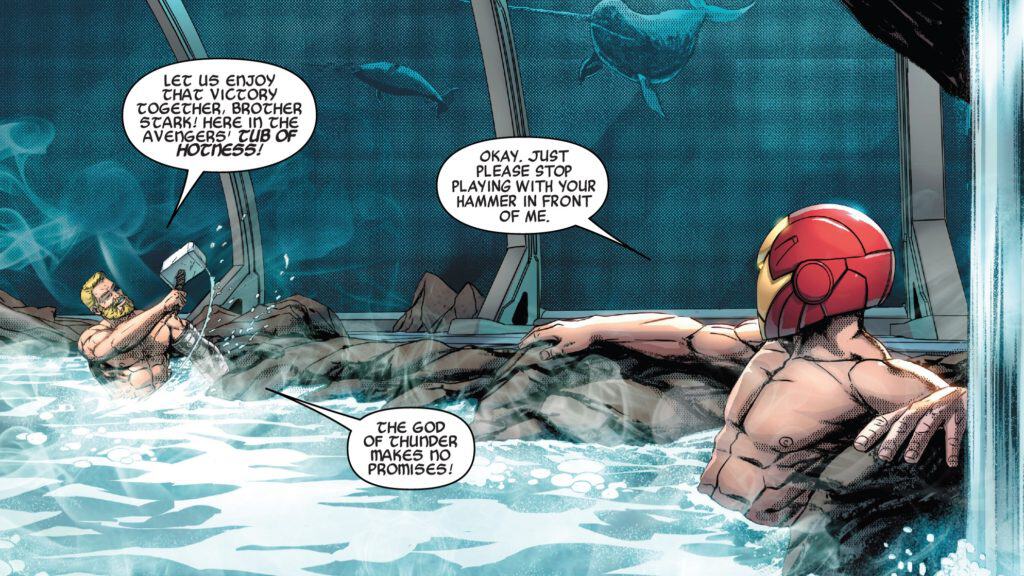 The bulk of the book takes place in the hot tub section of the Celestial’s body, although it isn’t laid out where that may be i figure it’s down low since there are rocks and such, I’m gonna call it his butt because it makes me laugh. This scene is where Aaron really shines this issue, the Avengers seem relieved and at ease leading to some great moments, but a lot of it is tinged with the worry of a group of people not accustomed to downtime. Really solid stuff.