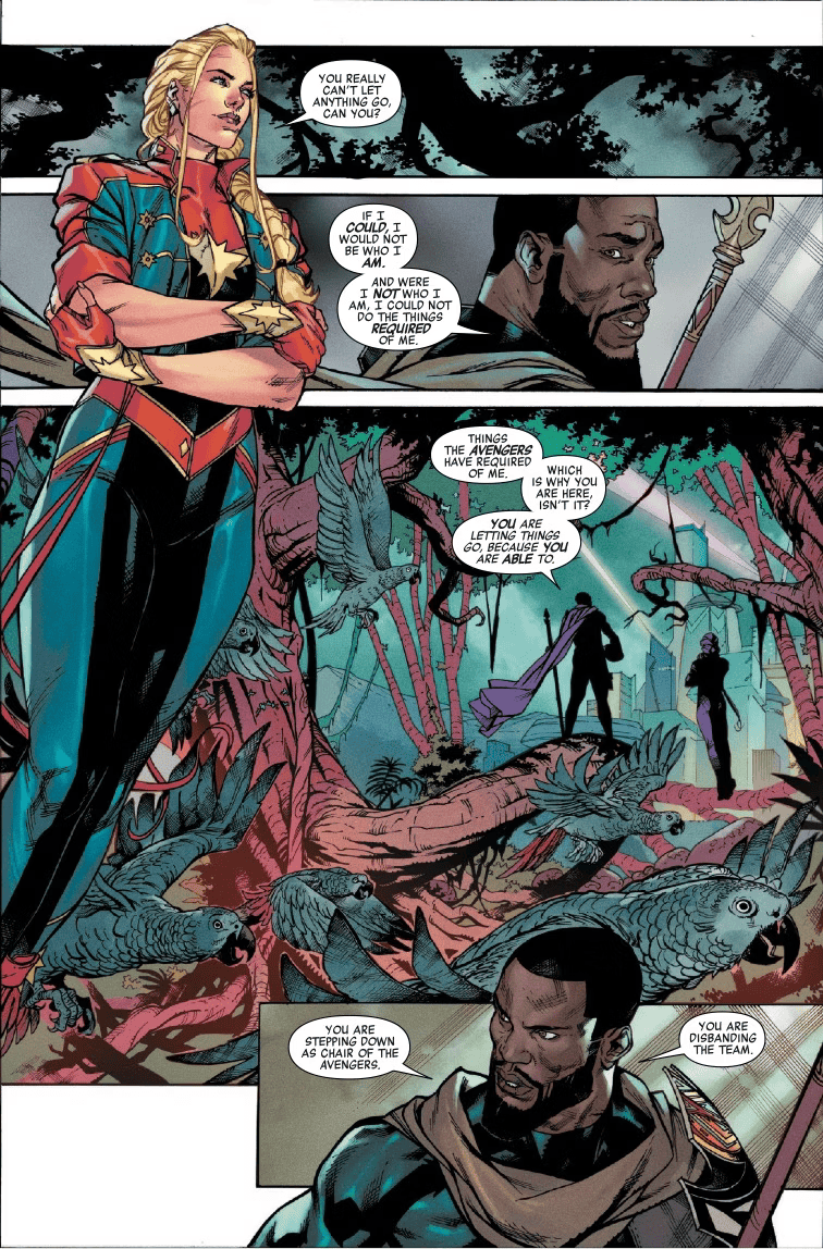 The clear metaphor here is veterans returning from war, or any public servant retiring from duty: individuals who ponder every action taken and decision made over the course of their career, questioning if they made enough of a difference in the world, and what to do with themselves next. T’Challa, Wanda, Storm, Vision and Tony all have different perspectives on the matter, and each conversation is organically philosophical in a subtle way. The Avengers also say bon voyage to Camelot, the living city they came to call both “home” and “friend” over the course of their adventures. While it may not be a tearjerker, the moment tugs at the heartstrings; the city was an experimental yet fresh addition to the cast, more memorable than the other original characters writers and artists have attempted to force onto the roster in years past.