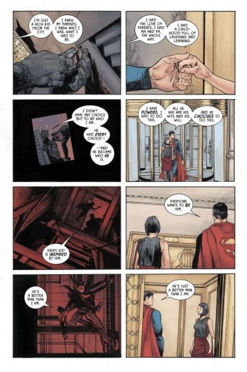 While on their stakeout Batman gushes to Catwoman, on how Superman grew up, and as a result how he really looks up to him. He tells her how “I didn’t have a choice but to be who I am. He had every choice, and became who he is” he says about Superman.
