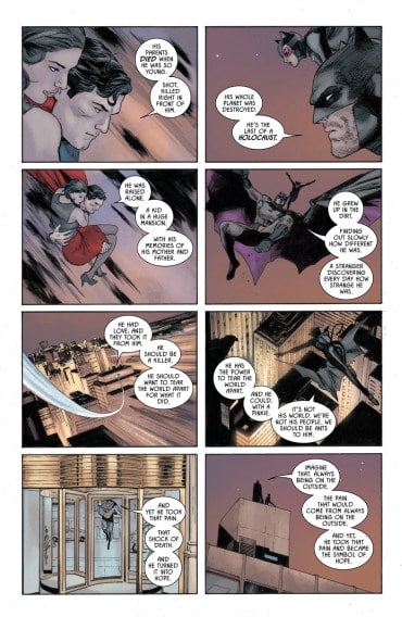 Selina however, is busy navigating through Batman’s excuses and explains to him that he is Afraid. She asks if Bruce is ashamed of her, and we get a similar explanation for both Batman and Superman.
