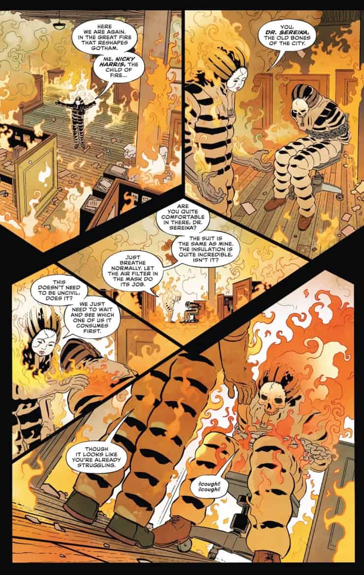 Nothing is as simple as it seems in the Gotham City of “Dark Patterns.” Behind every fresh horror, there is deep sadness. Behind every grotesque monster, a tragic victim. But not everything can be justified or made sense of. The World’s Greatest Detective’s greatest lesson as this series comes to a close is that some things just… are. As Dr. Sereika posits in the series’ final moments, “explaining” how The Great Fire of Gotham was miraculously extinguished, “Fire does often live and die by its own terms. We hope for a predictable pattern, but there are thousands of factors. […] We hope to understand after the fact, but it’s rare we truly do.”