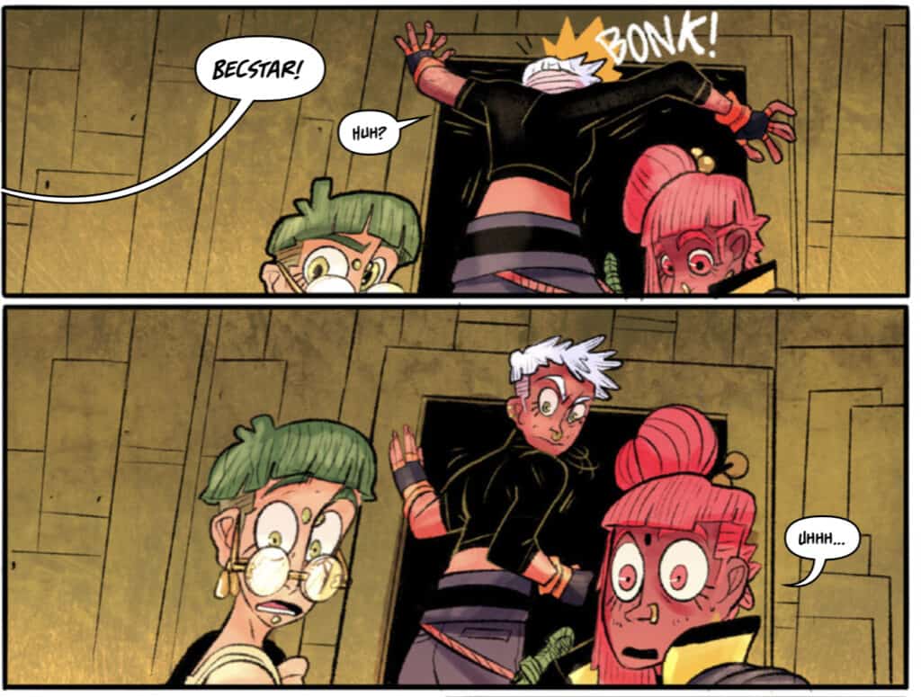 I particularly like the use of colors to depict the speed of Bec’s ship. The purples and yellows along with the distortions in the shape of the ship effectively show that the ship is traveling at a high rate speed. The ship could be going so fast that it may have difficulties in navigation obstacles as depicted in the impact imminent caption. The colors themselves show that, creating this groovy vibe to it.