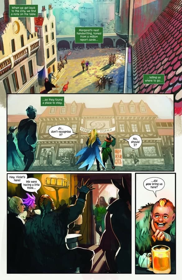 The setting, as envisioned by writer Kieron Gillen and artist Hans, is an eerie fogscape recalling the mirage-filled “realm of art” from the series’ second issue. The Wasteland, however, is far more monochromatic and dreary. And as with everywhere in the world of Die, it is a location haunted by grief and escapist fantasies. Hans’ artwork is evocative and unsettling, especially as fantasy and reality blur into one. Her interpretations of visceral horrors and subtle emotional moments prove equally memorable. I will note for those with medical PTSD that a hospital setting features extensively. As for the new party member Sophie finds there, I’ll leave that for you to discover for yourself.