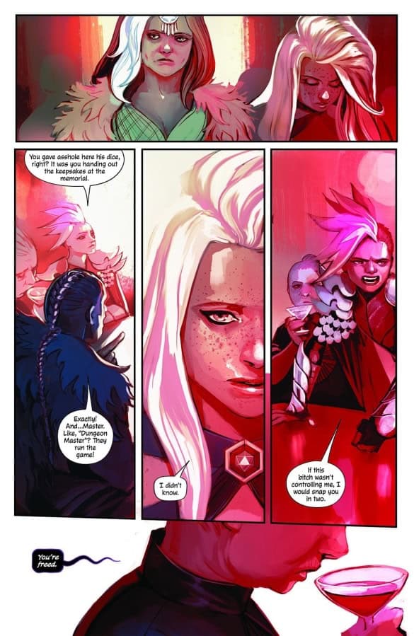 The issue’s symbolism is magpie-centric, as with Gillen’s Journey Into Mystery run (joined by Hans on JiM #645) and Once and Future, both of which also found inspiration in Arthurian legend. Unlike Journey Into Mystery and Once and Future, DIE: Loaded’s magpies don’t talk (thus far) but their presence alone says a great deal. The issue’s conclusion is one of DIE’s most shocking and sickening yet.