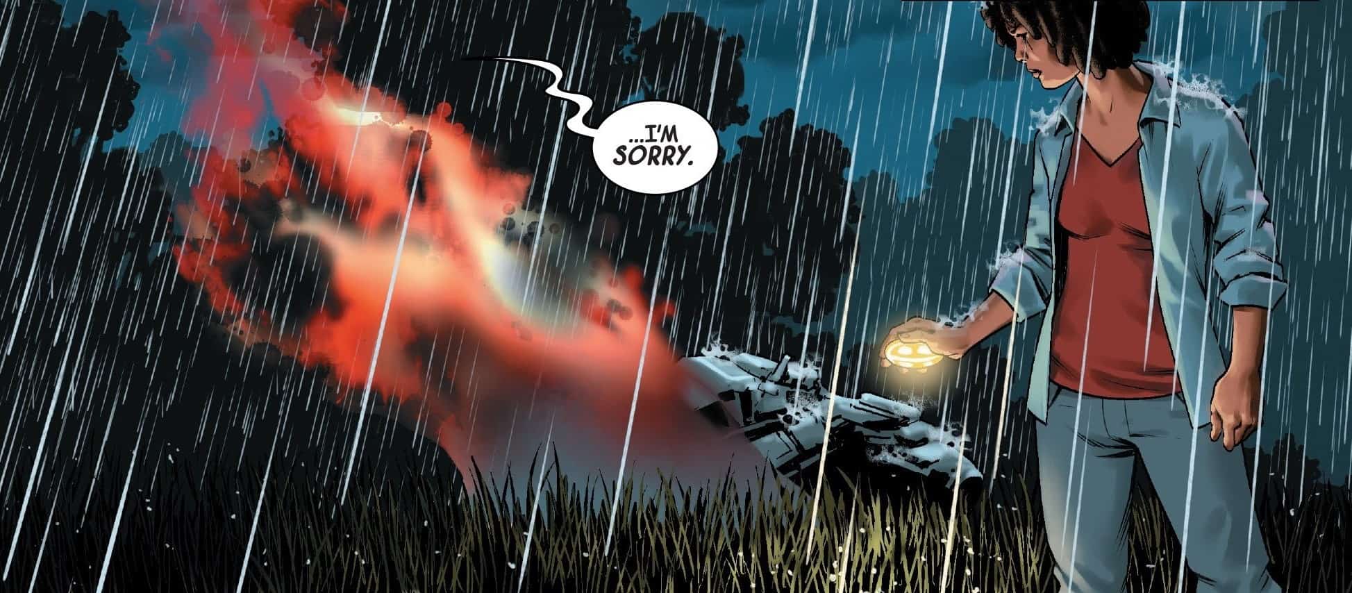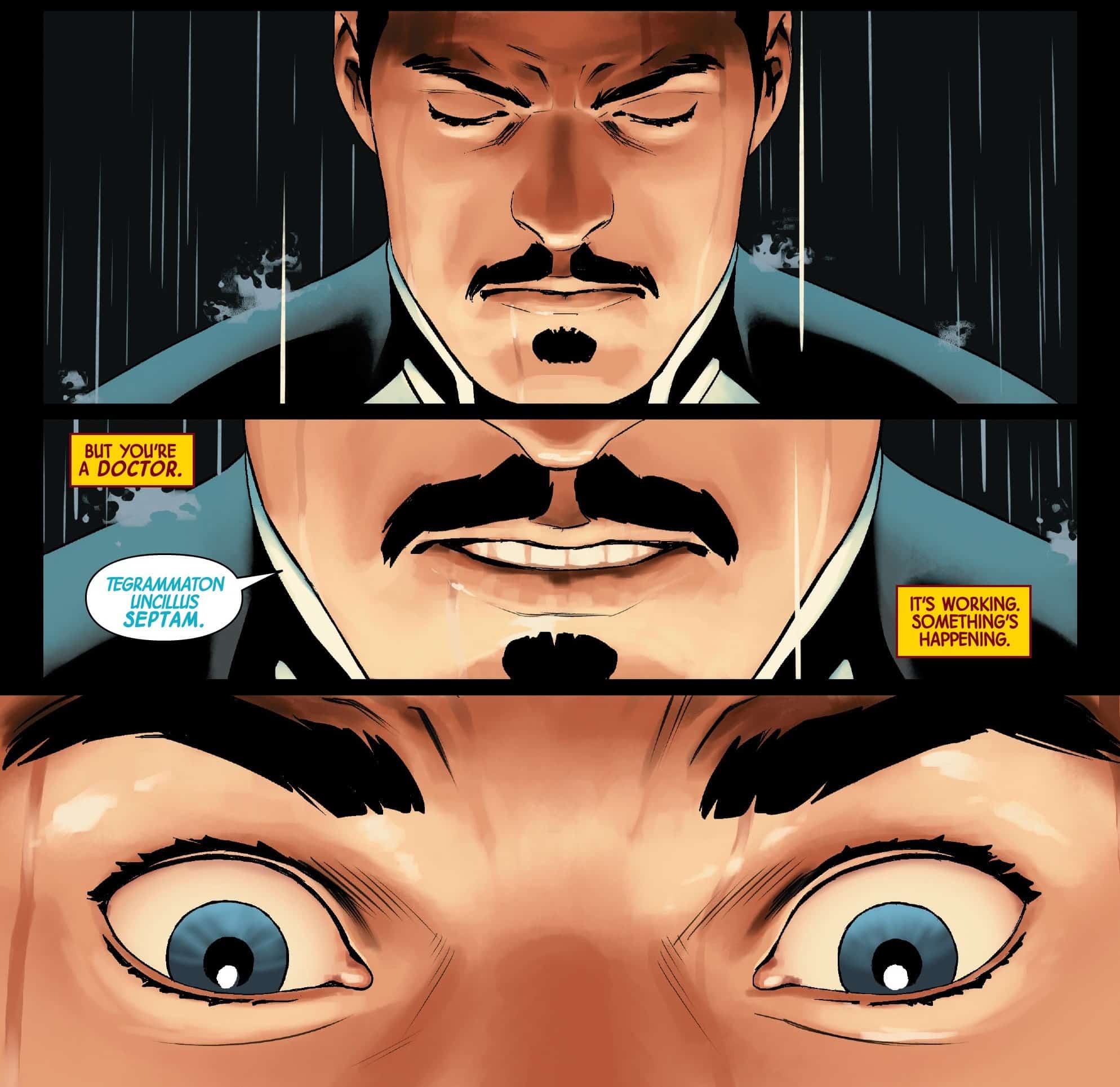 Like Strange himself Jesús Saiz once again works miracles with so little to go on, injecting as much drama and emotion into the situation as he could. And there was so much more going on in the nuanced scenery than the life saving surgery and the knitting together of newly formed hands. It actually seemed I could feel the rain as it fell and made translucent tracks down the faces of those involved. This really does echo what I’ve said all along about this artist and the fact he clearly has an eye for the cinematic. This alone lends the impromptu roadside brain surgery its drama and impact and gives Grey’s Anatomy a run for it’s money.
