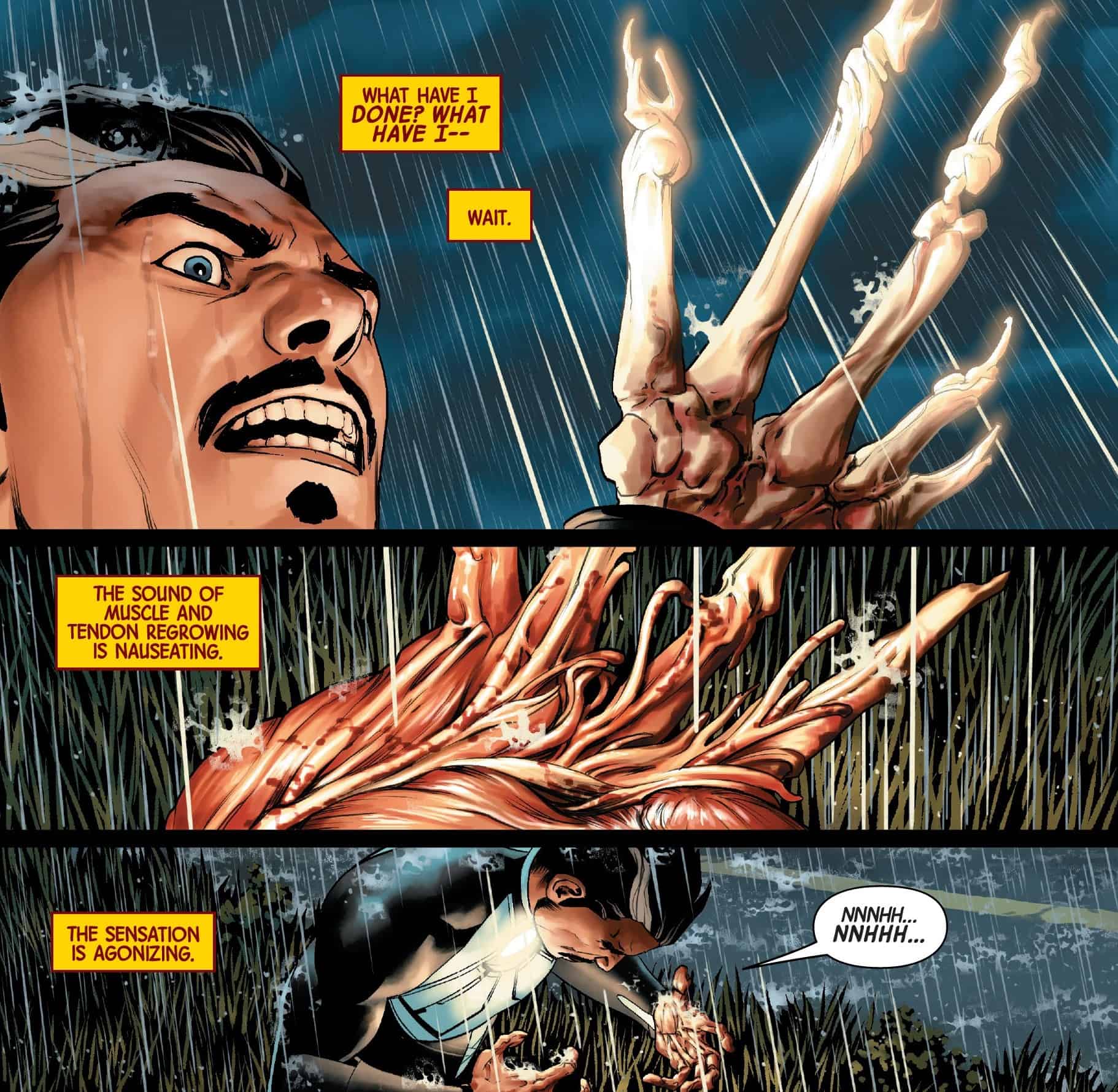 Thankfully there was the saving grace of the art. From the ‘full impact’ cover to the unfolding events within the mood was set throughout solely by the visuals, in a way the writing just couldn’t pull off. As such Jesús lends the whole instalment all of its dramatic impact from beginning to end. The first spark of actual emotional plight was only invoked by the sight of having Strange reconstruct his hands from nothing. As the bone and sinew reforms in front of his (and our) startled eyes I actually felt them knitting together and reforming along with the story itself.