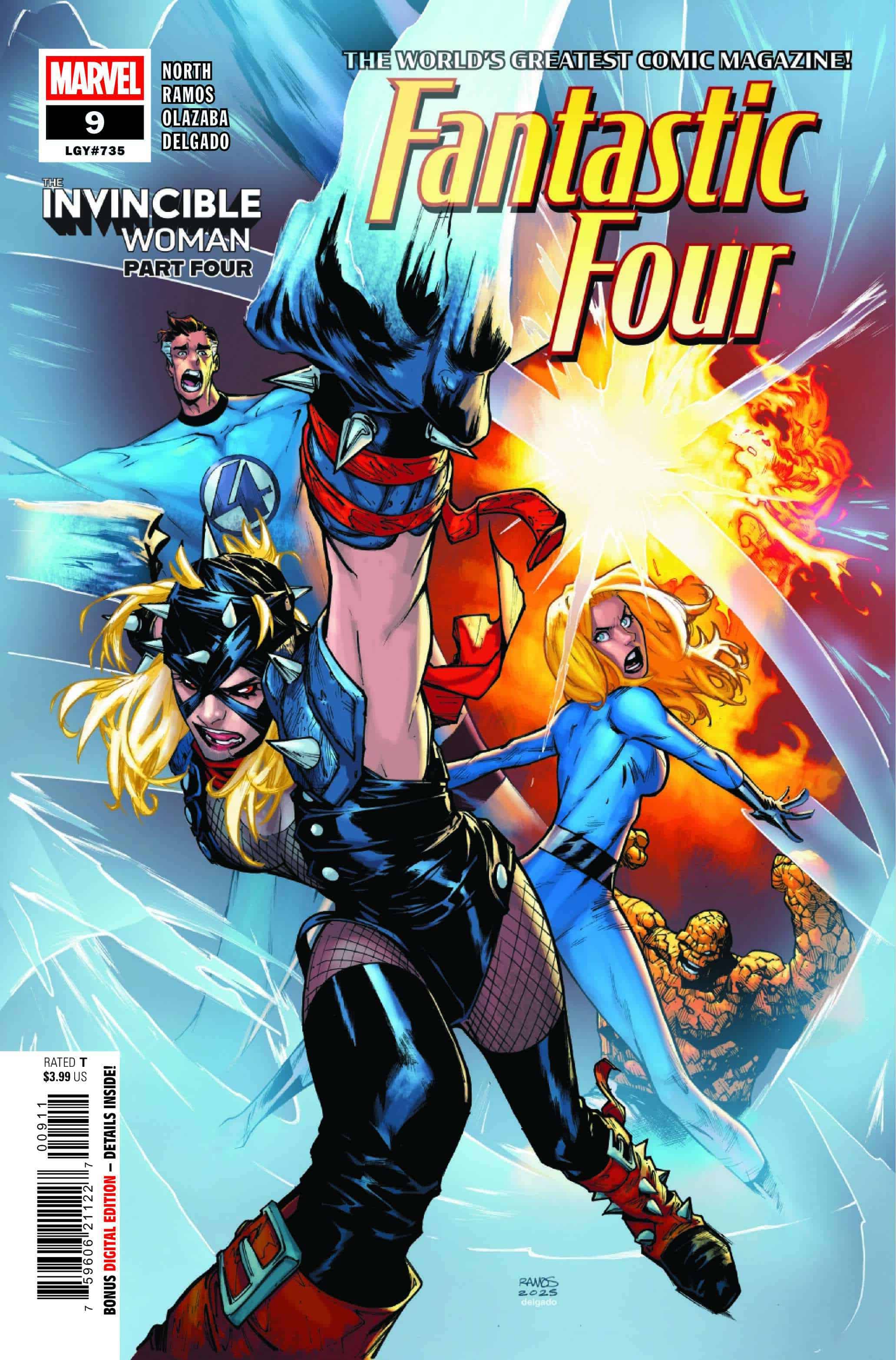 Ramos’s work is front and center from Fantastic Four #9’s first page. In a rare development, North steps back, delivering a comparatively simple narrative while the art team goes all out delivering on it. This begins with the high level of detail Ramos brings to bear. For instance, there is the sequence with a small army of alternate Invisible Womans (created by way of force field manipulation). Ramos establishes them in a wide but vertically compact panel. The Invisible Womans aren’t seen particularly close up, but Ramos maintains detail on their costumes and even their expressions to an impressive degree. Later, an even wider, more distant look at the army once again includes an impressive amount of detail as they stand off against the team.