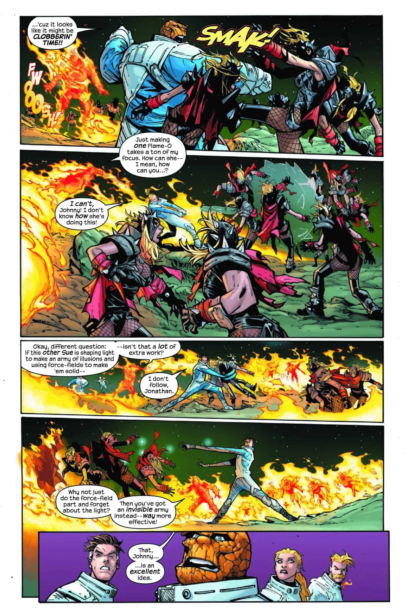North’s story in Fantastic Four #9 is effectively split in two. The larger, issue-long concern is the fight between the Fantastic Four and the alternate Invisible Woman. This fight isn’t as straightforward as it sounds. Thanks to the antagonist being a sort-of all-powerful Invisible Woman, North is able to be creative with the fight–such as the different ways the team fights the alternate Invisible Woman’s invisible army.