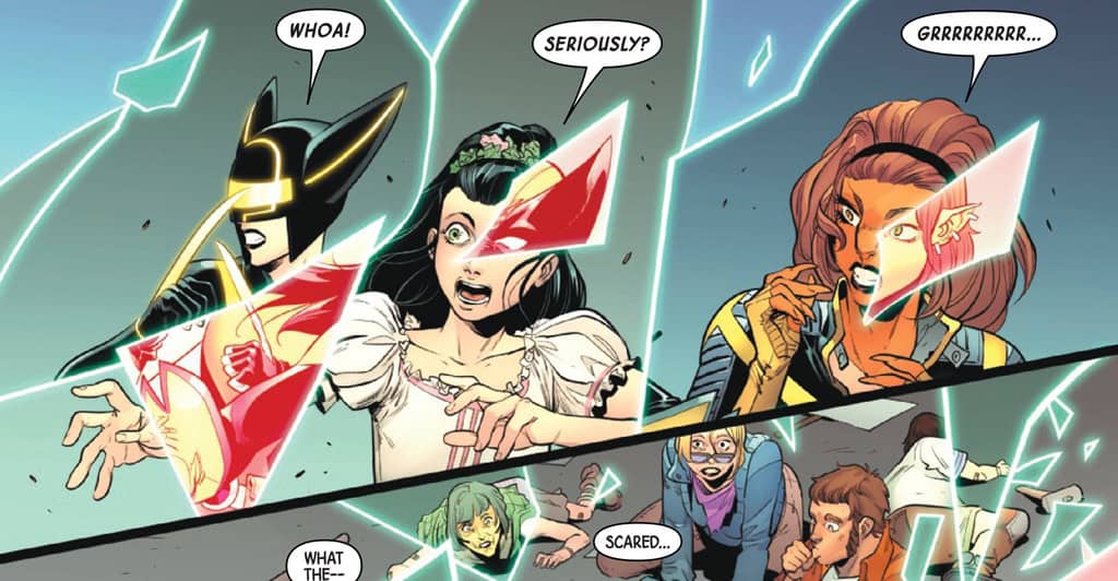 The Kinney sisters are back and right in the thick of it as usual! Jody Houser, Jacopo Camagni and Erick Arciniega drop us straight into the action. While defending a mutant from an angry mob, Laura and Gabby experience a weird time dilation which messes up Laura’s senses and healing factor. It’s a mystery that must be solved especially because the weird time dilation reminds Laura of her oldest friend Kiden’s powers! Houser slips very comfortably into the back and fourth between the two sister’s while deftly giving us a believable and in character inner voice for Laura.