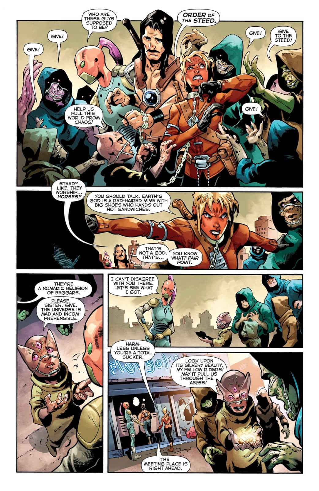 Disguised as two Bounty Hunters they take Scrapps through the marketplace. She is leading them to her contact. They encounter some colorful alien species, but they soon see that Scrapps is both well respected as an outlaw, and a smooth operator, as she helps get them in touch with their quarry.