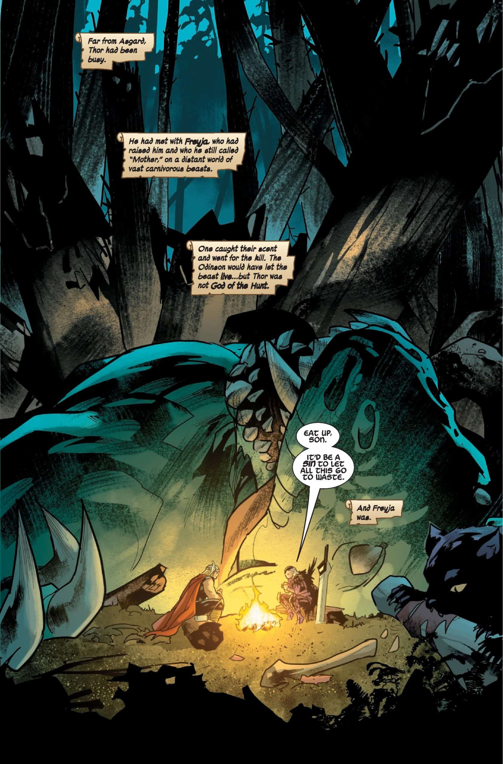 After a few uneven issues, Immortal Thor seems to have found its footing again as the series enters what may be its concluding arc. While the previous issue left it murky where the Thunder God had gone off to, the opening page of Immortal Thor #20 makes it immediately self-evident: he went to see his mum. Thor, in his gut—and we via the ad copy and narration—understand Thor is about to set off on his “final adventure.” It appears Thor is going to die soon and this time die for good. Of course, death is rarely if ever final in superhero comics. Immortal Thor’s narrative has itself nodded to this reality through Thor’s desire to “escape the cycle” he and everyone around him is trapped in. And if everyone is functionally immortal, how can death or change have real meaning? Whether Thor will die—and if so for how long—remains unclear, but the way series writer Al Ewing explores the subject is certainly thought-provoking.