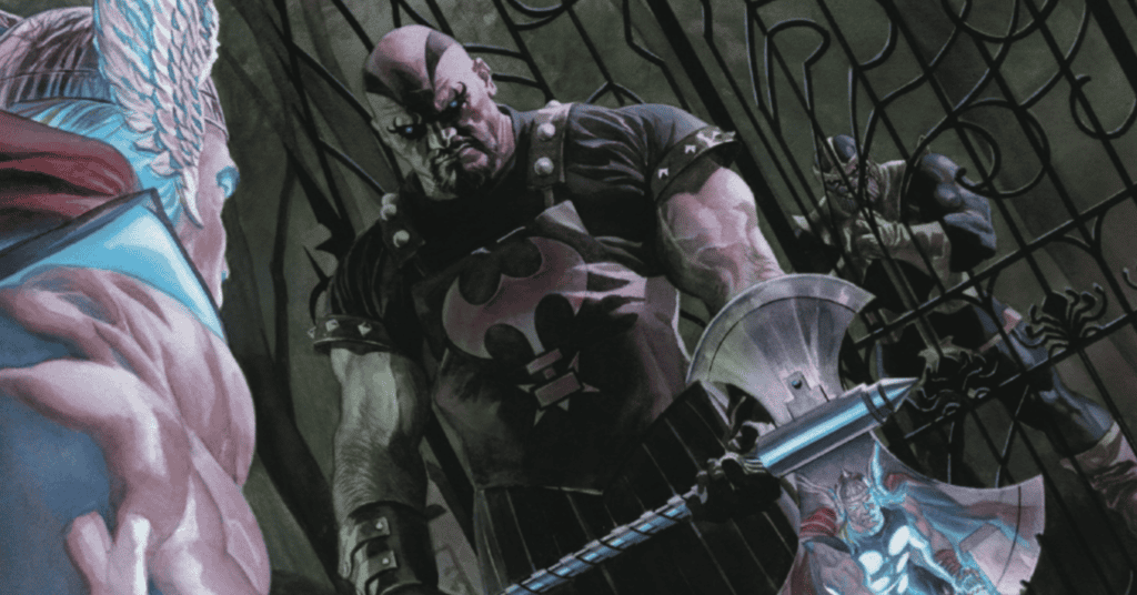 Freud believed humans are driven by two equal and opposite forces: a life drive urging us towards creation, procreation, and survival, and death drive urging us towards aggression, self-destruction, and death. And while Immortal Thor #21 may be about Norse gods, it’s nonetheless the tale of two men fighting over who gets the best death. Picking up just where the last issue left off, the story sees Thor confront Skurge at the gates of Utgard. Skurge has been waiting in the hopes of killing Thor to reclaim Thor’s nobler heroic death as his own, as he once did on Gjallerbru (Thor #362, 1985). Thor, meanwhile, vowed at the start of the last issue that “no other life will be given or taken to prolong [his] own.” And it’s a vow that’s been getting challenged every moment since. Skurge and Thor’s fight to the death–and for the best death–is watched over by a mysterious presence that has poetically taken the form of Thanos, a supervillain famously in love with Death. Throughout, writer Al Ewing maintains a delicate balance between dynamic action and character development, bringing depth to a figure who has often lacked it.