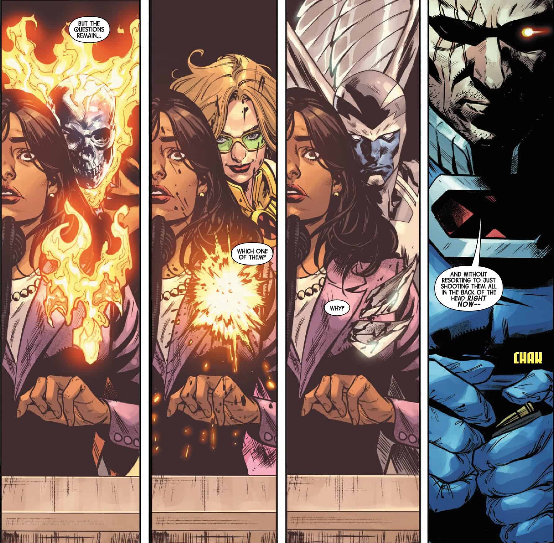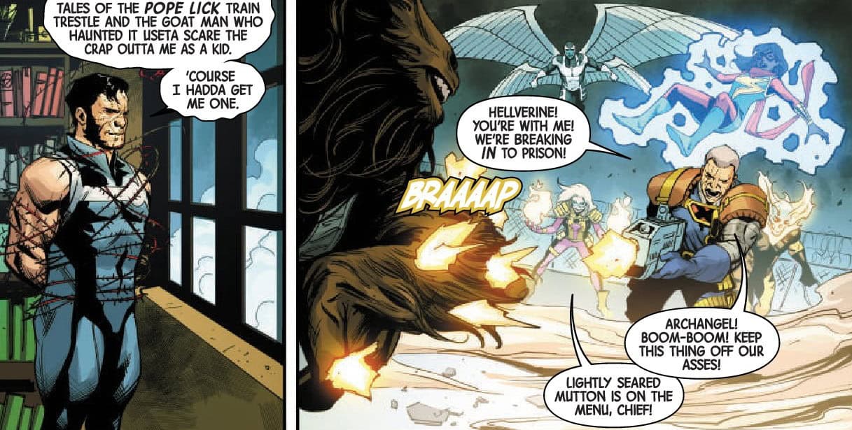Michael Sta Maria and Romulo Fajardo Jr get to have a great deal of fun here as they get to show off Angel facing Daken in the Danger “Living” Room (this book has got jokes, good ones) in a subtle nod to Archangels classic fight against Wolverine in the ’90s, supernatural brawling against all manner of creature in the prison fight, a goat man, an actual angel, Cable catching the heavy end of some blood magic to more subtle but fun stuff like the team flying off on a mission with Ms. Marvel enjoying the in-flight snacks, her older companions’ body language perfectly communicating their personalities to Domino looking through the scope of her rifle at the supernatural battle below with her squirrel buddy in frame to the side.