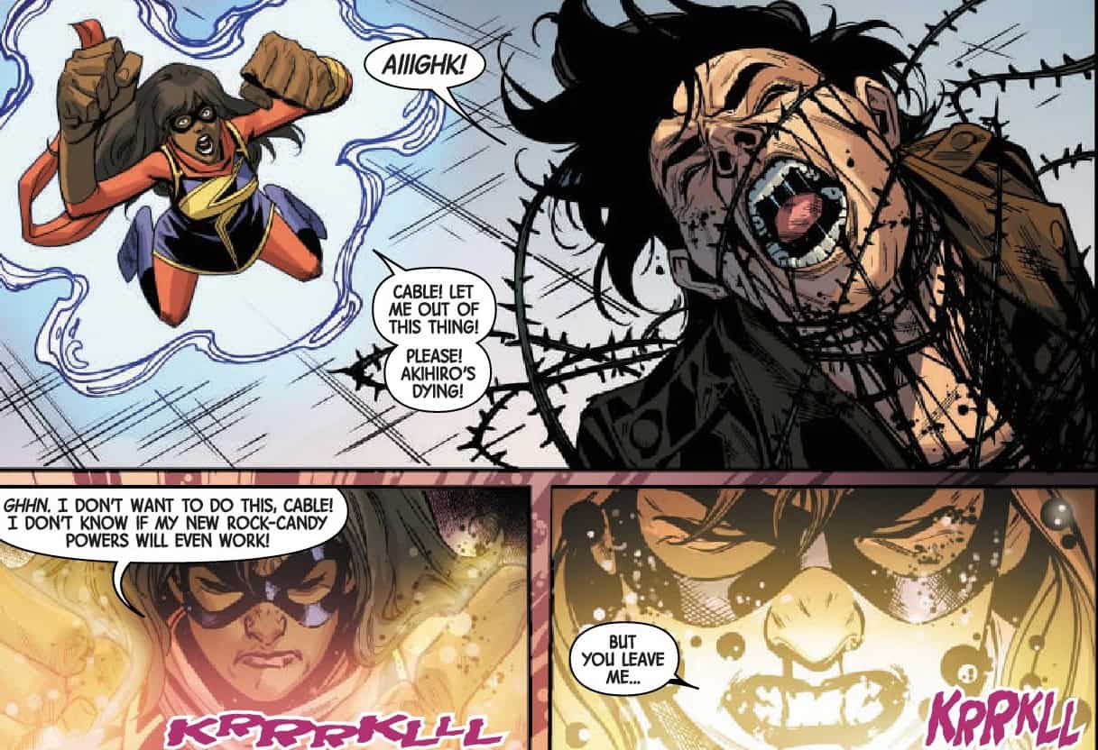 What makes this work is while Cable is certainly the focal point of this series, every character around him feels fully fleshed out, Seeley has admitted several times to being a major x-fan and it really shows in how he writes every single character. Everyone feels like a fully fleshed out personality on the page. This issue Daken is the focus of Cable’s attention and while the mission to sort out the supernatural human terrorist group is the face value goal, Cable always has an ulterior motive as the assault on the prison not only tests and proves Daken’s innocence but also shows off why Kamala Khan is the purest of souls and as Cable says a leader worth dying for. There’s some gnarly supernatural action toward the end of the book as Seeley and the team juggle pushing the story forward with the kind of violent action you would expect from an X-Force book but the additional element of Kamala Khan right in the middle of it all makes it feel fresh.