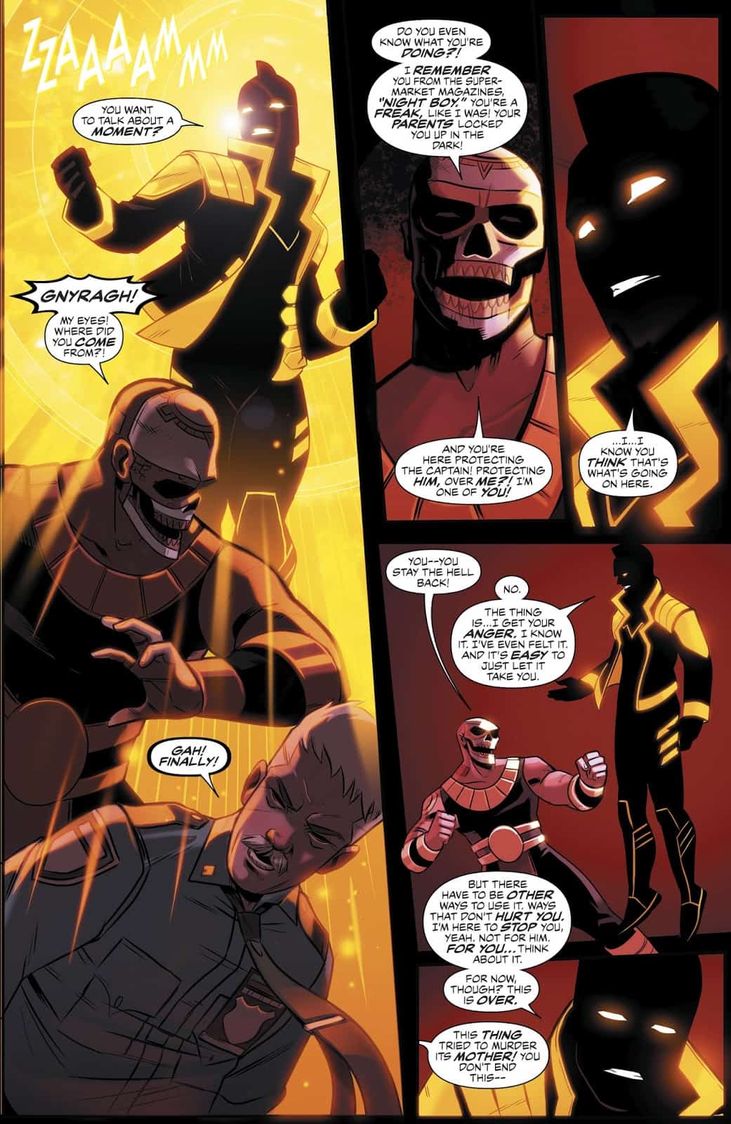 The light goes out! Even though it’s daytime. Pitch Black envelopes the room, and Then a Bright Flash of Blinding Light. Aztek and Ray burst into the scene and attack the Sons of the earth. One of them explains that they killed the Former Aztek.