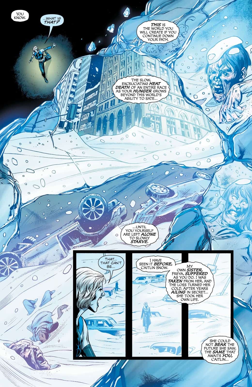 The Justice League of America is just recovering from their attack by Prometheus. Caitlin emerged from the bedroom seemingly Cured of her Heat vampirism affliction. She has a vision of a frost riddled Apocalypse that she causes when her power goes out of control and is consumed by guilt and Fear. In that moment she meets Queen Tsarita, who Grants her wish, to be free of her illness.