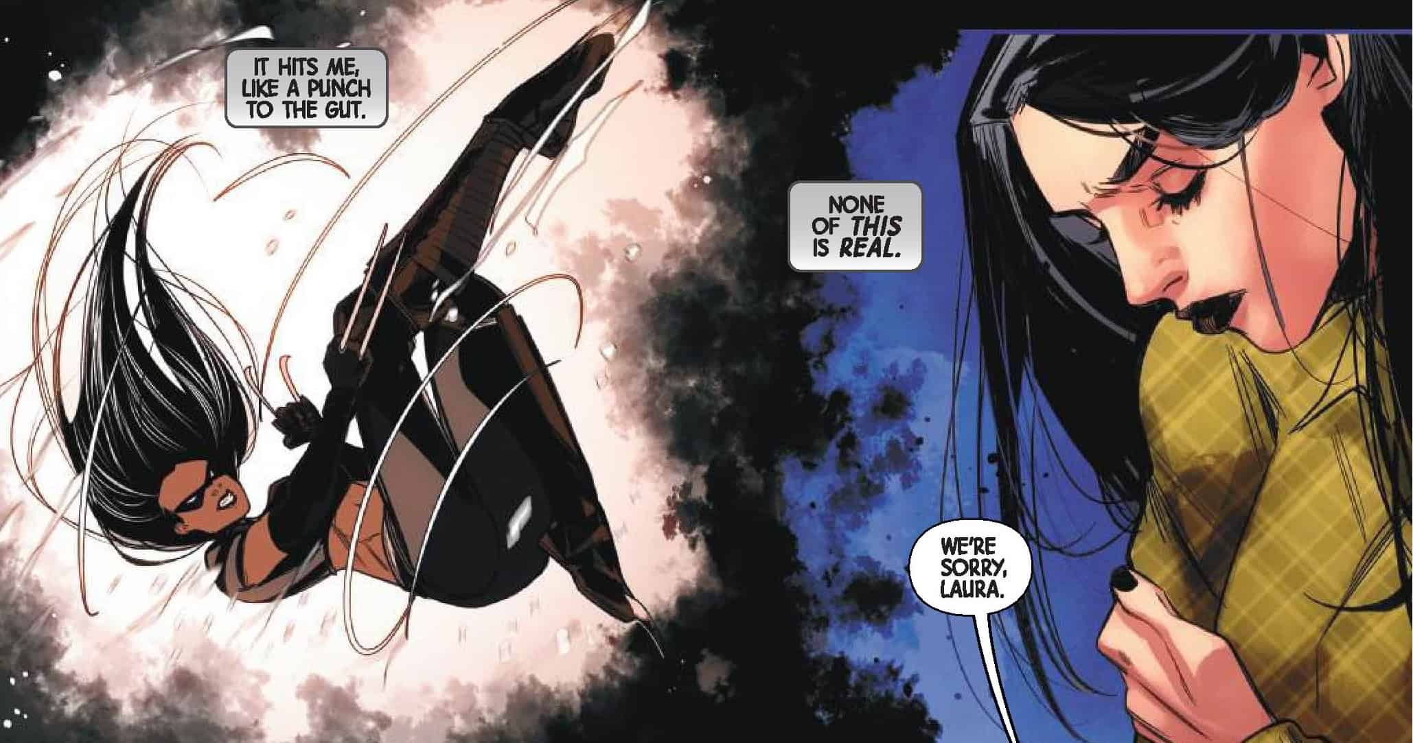One of Laura’s biggest buttons for much of her history was about her identity and sense of self. She agonized over the question of whether she had a soul, to the point she even wanted Ghost Rider to use his Penance Stare against her JUST TO SEE IF IT WOULD WORK. Her resurrection, only to learn that her original self was still alive and therefore she’s not supposed to exist, should have been a MASSIVELY triggering moment for her (especially once Talon died for real).