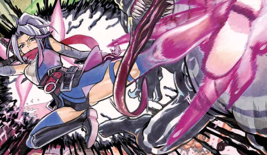 Peach Momoko is one of the most in-demand artists at Marvel, lauded both in the industry and by mainstream fans for her watercolor art and sumi-e line work. Her story is short, sweet, and lightly haunting. The tale of the Sym and the stone where unwanted children are sacrificed is dark and unsettlingly realistic for the time period. The character of Sai (Psylocke) carries a dreamlike, distant memory ambience that makes her blend into her surroundings much like an impressionist painting would. This short is written in Peach Momoko’s award-winning “Momoko-Verse,” which includes their Demon Days and Demon Wars comics from Marvel.