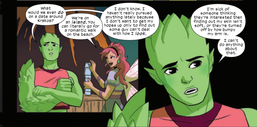 Once Pixie and Graymalkin begin discussing Anole’s dating life (or lack thereof) we dive into another common queer topic: body image and dysmorphia. As a gay man myself I have witnessed first hand how judgmental other queer people can be about looks and certain imperfections. Sure, Anole is discussing his mutation specifically, but when seemingly talking about dating other mutants and still facing prejudice because of his appearance the correlation between Marvel’s mutants and the real-life queer community is made again.