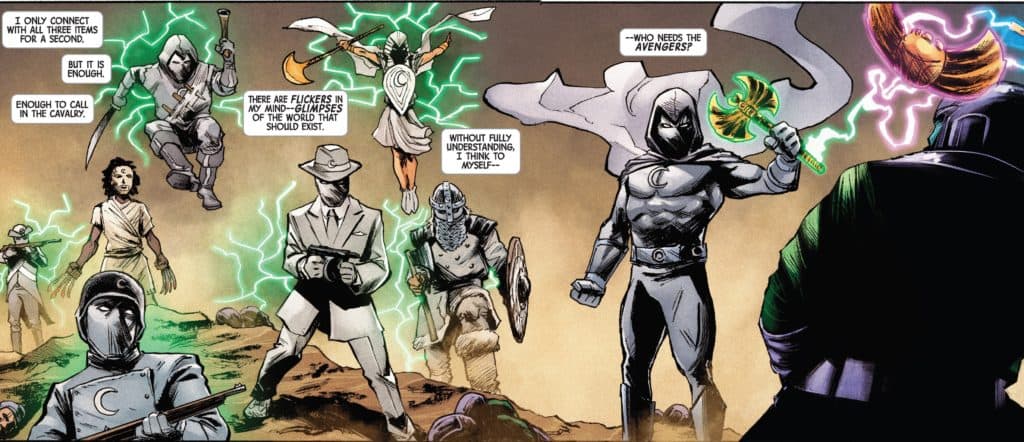 There’s a sort of noble savagery to this original Moon Knight that amplifies the nature of who and what the character is, and where he comes from. This Savage Moon Knight doesn’t speak. Only protects, and acts. Stoic to the end, leading the assembled Moon Knights from across time against Kang. It’s not the most elegant ending, and perhaps a tad unconvincing given the enormity of Kang’s usual power set, but for this story, it works – as well as highlights the never-ending fraught relationship between Khonshu and his various pawns throughout the centuries. Illustrating endless variations of the lead character isn’t a new concept, but it does broadens the scope of Moon Knight’s history. And it’s just plain fun, to boot. And sometimes that’s all a comic needs to be.