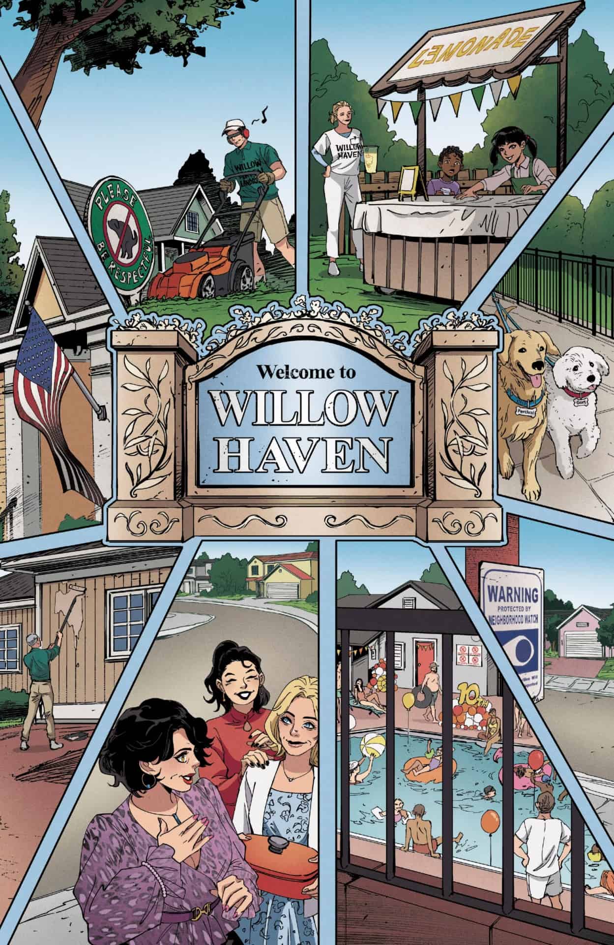 Neighborhood Watch #1 opens with a dead body and two people, mostly unseen, standing above the body in shock. “What did you do to her?” they shout. Following that mysterious first page, Neighborhood Watch #1 is an exercise in fun juxtaposition. There is a housing development with a home owner’s association and a voluntary collective. Gailey tells the story of both on alternating pages.