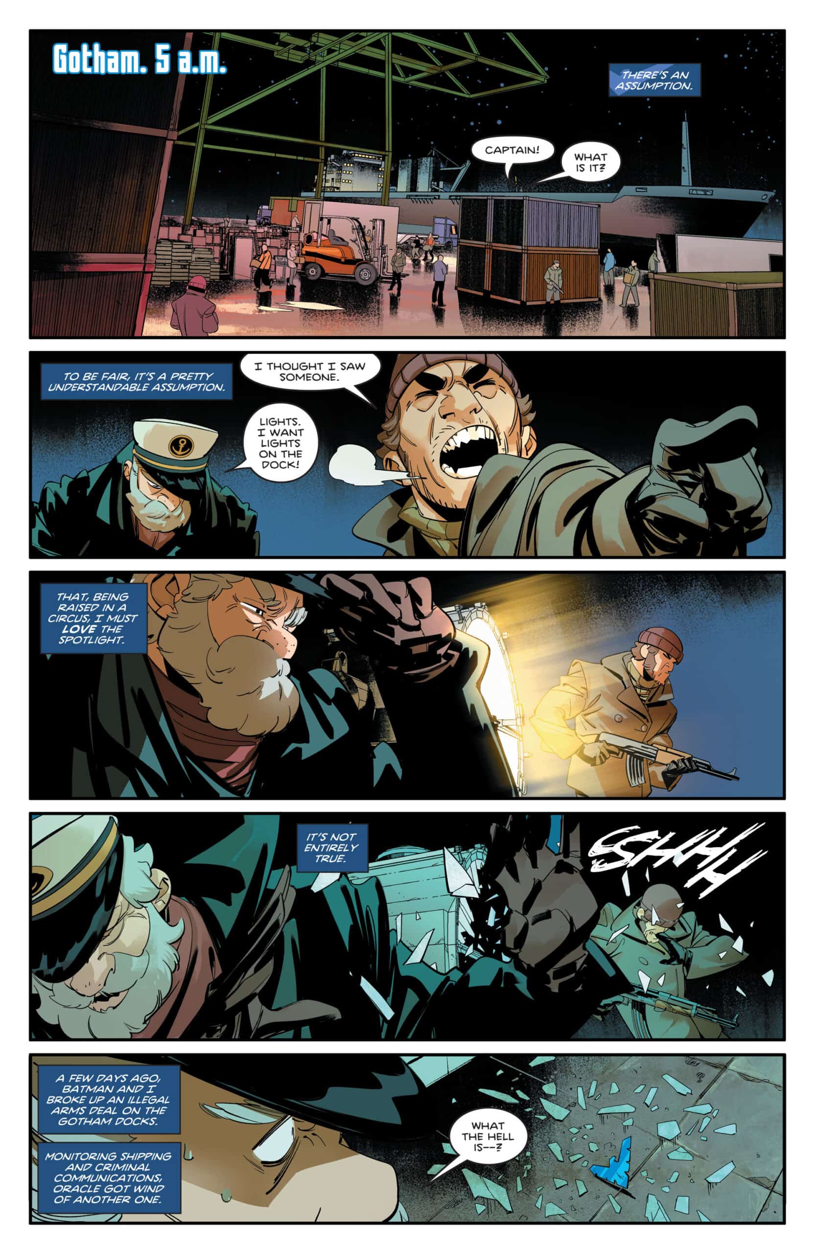 Switching from Di Nicuolo to Redondo feels organic and cohesive in the issue, the two styles feeling distinct yet unified when colored by Lucas. The palette blends the warm yellows and oranges from the pizzeria with the cool blue and grays of the docks/warehouses of Blüdhaven. It’s an excellent contrast that illustrates the dichotomy of Nightwing as a hopeful vigilante, operating in between the pulpy shadows of Batman with the bright costumes of the larger DC Universe. Without Lucas’s coloring in this issue, the art would be one-sided or clash against one another due to the two very distinct styles.