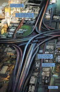 This is further reinforced by the coloring on the page. The color scheme for the super highway is all black and gray with the only hints of brighter color representing car headlights and tail lights. The rest of the city is more alive–a bright white and yellow downtown, green fields of grass, a large section of trees in browns and straw, etc. This art and coloring provides a good visual representation of the menace the super highway represents as built up through the dialogue and Nightwing’s inner monologue.