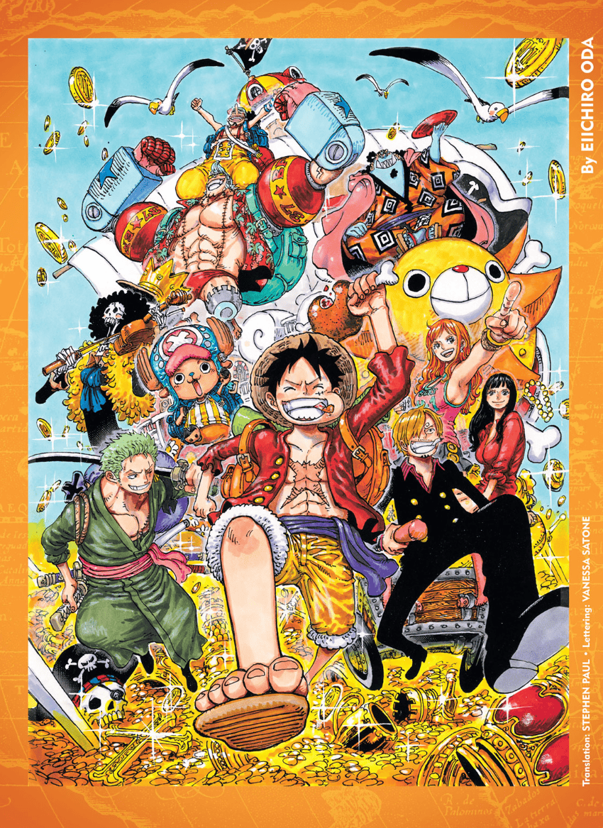 As a nice bonus this week, we have a colour spread to analyse, and I’m happy to say- it’s a remake of the cover for Volume 12, one that was a big milestone for the series, as our heroes left the East Blue and entered the Grand Line. I’m sure Oda has redrawn it to celebrate the release of the second season of the Netflix series. I particularly enjoy Franky and Usopp hitting the same pose together, and Sanji being overjoyed with pulling along Nami and Robin in the wagon. I also find it interesting that Oda pretty often depicts Luffy in his yellowish orange shorts and purple sash, a standard these days, showing just how important Wano was for his character, I’ve always taken the purple to be representative of his Gum-Gum Fruit, but that might be a stretch.