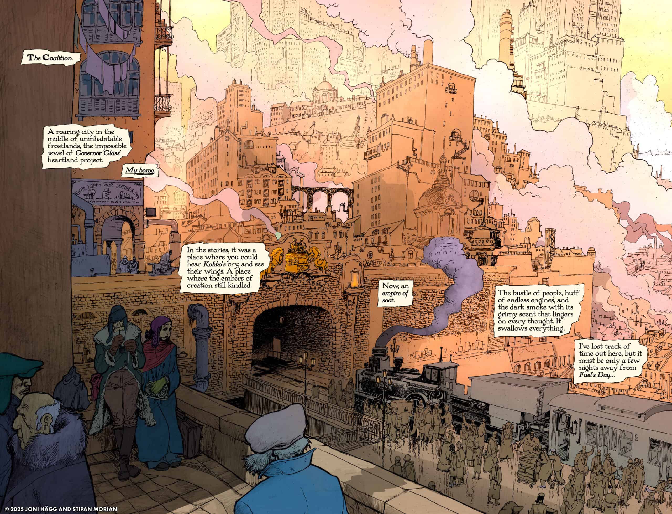 Ropemann’s coloring further adds to the scale. Shadows up front give way to dark orange which then lightens eventually into a canary yellow in the city’s furthest and highest reaches. The implication is a massive city, the buildings in which are big enough to shade other parts of it from the sun. The layers of smoke and fog, drawn into the expanse by Morian and given a slight gray tint by Ropemann, create a sense of early industrialization.