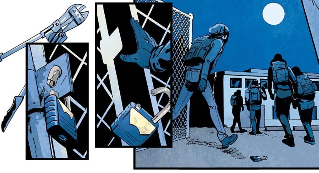 Story wise, the telling in fantastic. From the opening two pages, which are a flash forward to later in, the story is completely silent. The first words we read is from Haley in her confession, that later we discover is a written confession to the police. The last panel of the silent opening to the first panel with text mirror each other. The parallelisms run through the volume, as the first panel shows an older Haley which is juxtaposed with the younger Haley we will get to know and grow with as she becomes her older self.