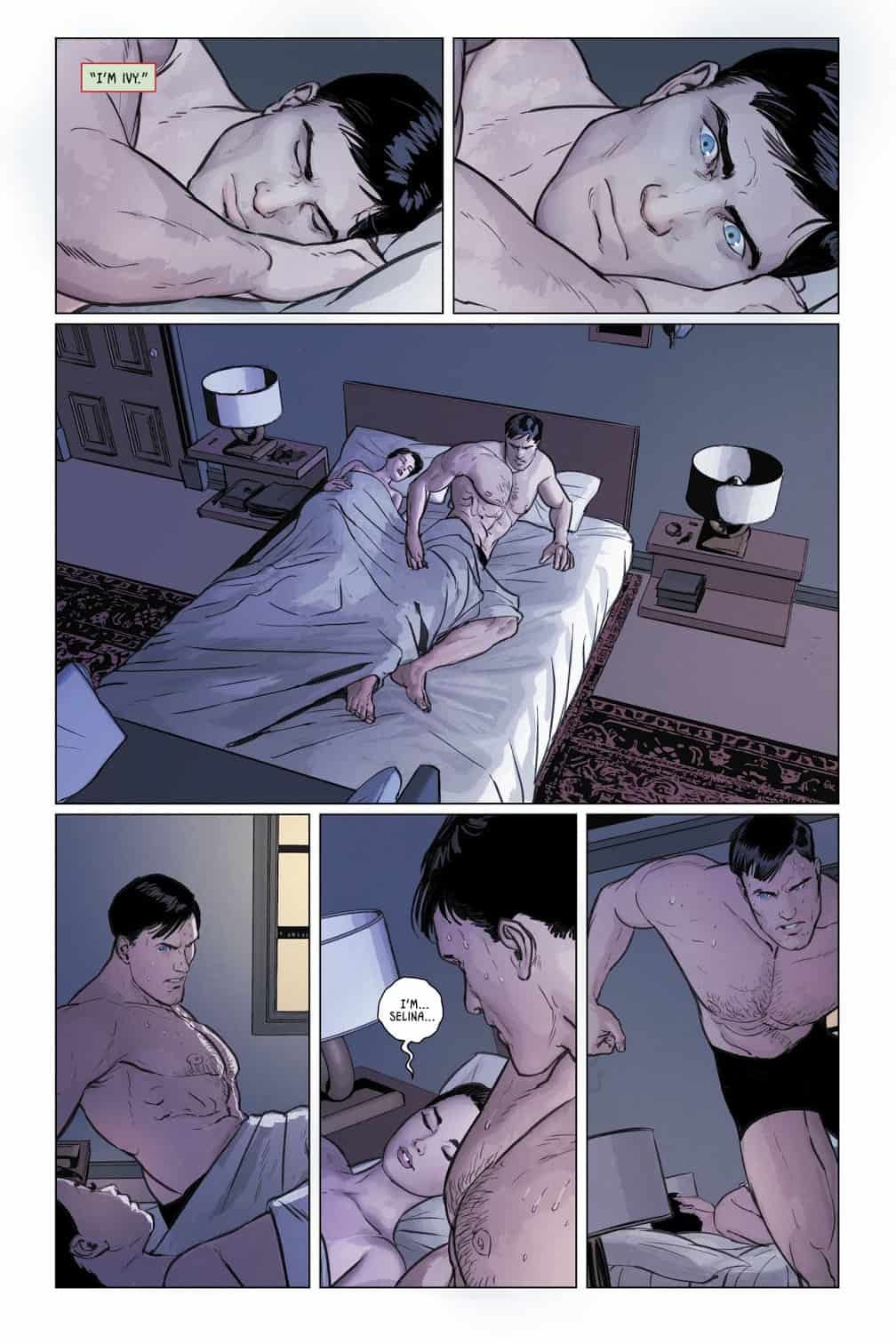 Bruce and Selina are sleeping soundly together in their bed, as Pamela Isley (Poison Ivy) speaks to them. Bruce wakes up in an instant and rushes toward the Batcave.