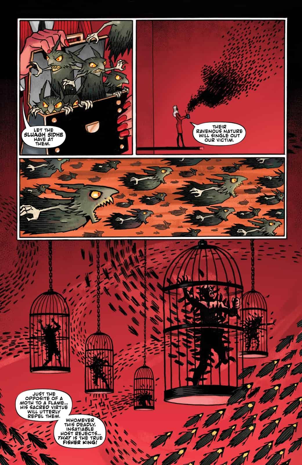 The Umbra Sprite examines the progress of their plan in her absence. She takes a tour of the facility Acheron Insurance, which now has a housing program for the homeless and Elderly. An elaborate ruse to find the Fisher King and kill him. They examine several candidates as they hang in large bird cages suspended in the air. To pass her judgment she unleashes the Sluah Sidhe, who would be repelled by the Fisher King’s virtue, but devour the flesh of any regular man they come across. The subjects do not fare well.