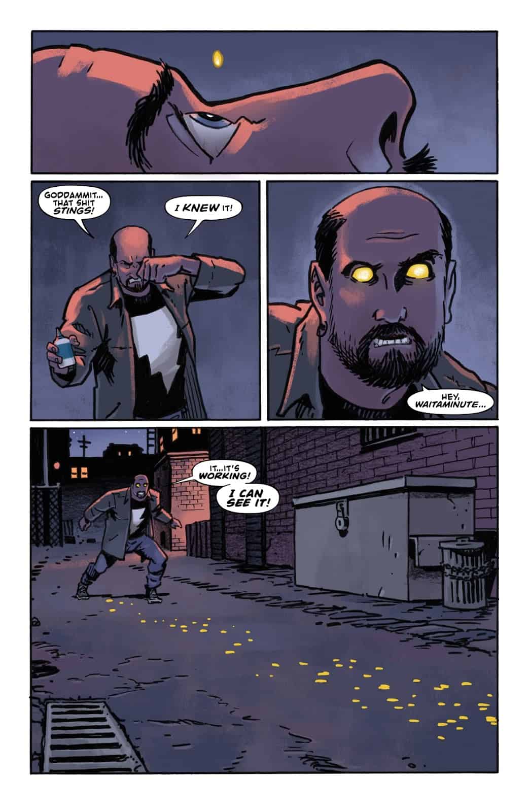 Kevin, against his better judgment, takes this opportunity to track the beast. He puts the drops into his eyes and is able to track the path that the Beast took when it ran away.
