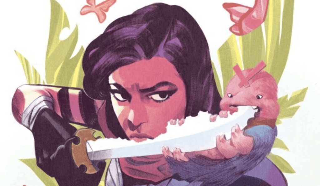 Casagrande starts us off with Sai chasing a version of Sleeper (the symbiote cat) who appears to have the elusive seventh gem lodged in its forehead. Casagrande beautifully illustrates this chase in a multi-panel format that shows both Sai and her quarry falling through the pages in an off beat manner as if they are skipping around the panels. The floating islands they are running on makes me think about Angel Island from Sonic the Hedgehog, helped along by Casagrande’s beautiful cascade of vibrant colors.