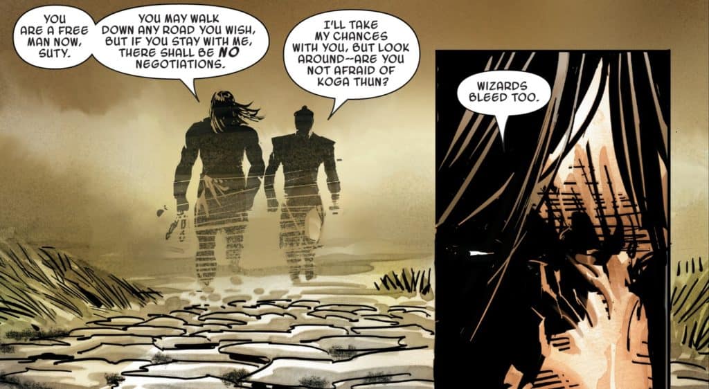 This issue was a decent amount of story progression with introducing the cult, having an amazingly drawn action sequence and nary a pistol in sight! It’s true, last issue was largely overshadowed by a bunch of dudes on the autism spectrum railing on the vision laid out in a 90 year old book series. (the aforementioned views are my own and based on personal experiences) Mud slinging aside I’m enjoying this series so far, although it is strangely paced but does have the feel Savage Sword often had classically of short somewhat self contained stories serving an overarching narrative.