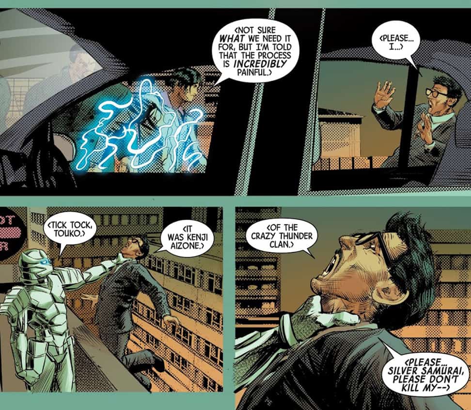 As heads to his car, he is approached by Shin Harada, the Silver Samurai, and two bodyguards. Shin asks Touko why he is stealing from him and shows him a video of the transgression. Shin threatens to go after Touko’s wife and daughter if he does not tell him who he is stealing for. Activating his Silver Samurai armor, he grabs Touko by the neck and dangles him over the parking structure they are on top of. Touko reveals that it was someone by the name of Kenji Aizone, of the Crazy Thunder Clan. He begs Shin for his life, but the Silver Samurai drops him anyway.