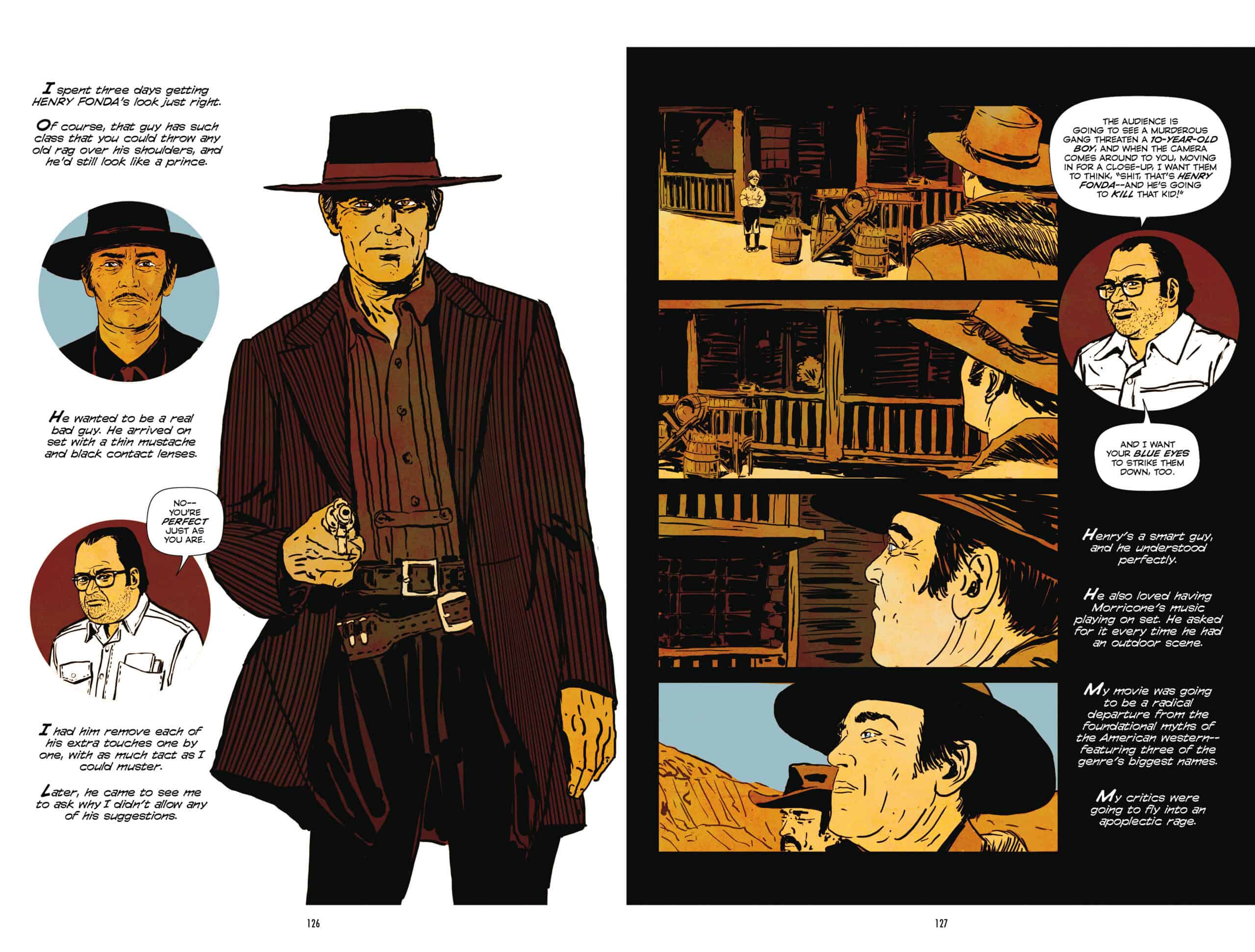 Settings and characters receive a truer depiction during the retelling of Leone’s experiences making his movies. Améziane doesn’t strive for a hand drawn or painted photorealism, but it is not the broad cartoon-like style used for Leone and the other filmmakers quoted for the book. It’s the most impactful art style here.