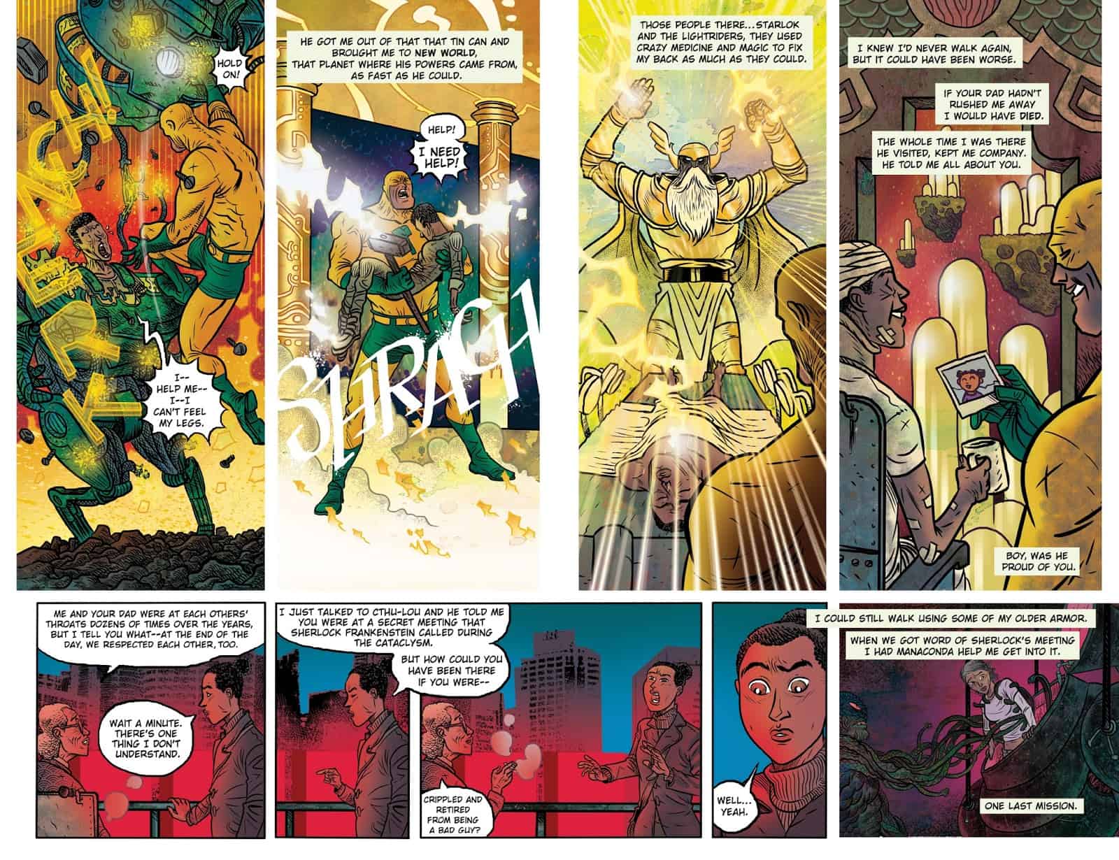 This issue opens with Lucy waking from a vivid nightmare after being knocked unconscious in The Hall of Hammer. The blow to the head has certainly not improved Lucy’s mood, and she redoubles her efforts. She tracks Metal Minotaur to a nursing home with nothing more to go on than the name N. Parker. She is surprised to find that N. Parker is an old lady in a wheelchair. Lucy tries to fish for some answers, but Ms. Weber sees through her immediately. She knows that Lucy is Black Hammer’s daughter, and certainly knows much more about Black Hammer than is expected. After going up to the roof for a cigarette, Ms. Parker recounts her career in super-villainy. She went up against Black Hammer many times in the seventies, and on every loss, she built more and more advanced armor. She builds a new suit of power armor so advanced it accidentally breaks her spine. Black Hammer finds her and brings her to New World and enlists the aid of Starlok and the Lightriders, the in-universe stand-ins for the Highfather and the New Gods. We learn that Black Hammer visited her during her recovery and they became uneasy friends, letting go of their past. Lucy presses her on the secret supervillain meeting that Sherlock Frankenstein had years after this. Though not able to walk on her own, Ms. Parker is able to move in some of her older armor and attends. She reveals that Sherlock Frankenstein had nothing to do with the Anti-God’s attack on Spiral City. In fact, he’s trying to rally all the other supervillains to help defeat him. After the story is over, the flashlight Lucy was clubbed within the previous issue falls from her purse, and Ms. Parker recognizes it as a Spiral City Asylum issued flashlight. All the pieces falling into place, Lucy realizes Sherlock Frankenstein was never missing. He was at the asylum the whole time. She rushes there, and after a brief altercation at the gates rushes into find Sherlock Frankenstein.
