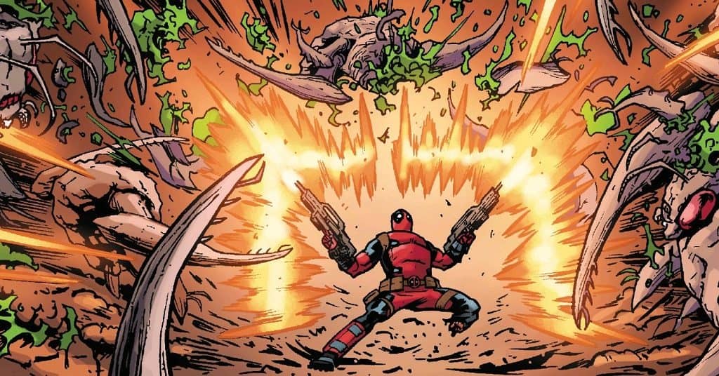 Another nice detail in the art is Deadpool’s use of the guns from Starship Troopers.
