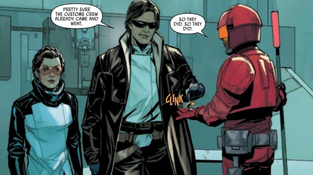 The very best thing about this series from the beginning has been the art. The characters looked like they were ripped right out of the films. Naturally, new artist and writer means a new feel. Phil Noto’s art does not always make the characters look exactly like the characters in the film, but it’s in no way bad. However, the writing by Greg Pak captures the personalities and voices of the characters well enough that they still feel like the old gang we know and love. The dialogue between Leia an Han is a typical mixture of insults and backhanded compliments. Luke and Artoo are all business.