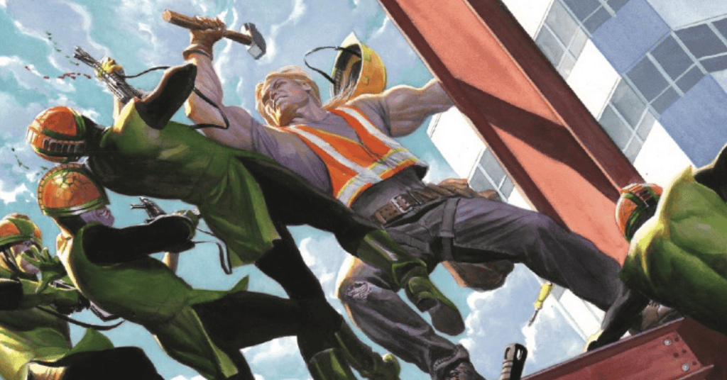 Thor has been reborn on Earth as a mortal amnesiac construction worker named Sigurd Jarlsson in a world that has forgotten that Norse gods once walked among them. Loki has taken on the guise of a mischievous street urchin named Lucky. Sigurd’s neighbor is an artist haunted by visions of gods—of Thor. Last issue, Sigurd hunted down a white supremacist biker gang paid to intimidate immigrant day laborers (Sigurd included) at a Roxxon construction site. He fought the bikers with an improvised weapon: a short-handled hammer attached to a length of rope. Little did he know, Roxxon and the bikers were working hand in hand with another foe: Thor’s former alter-ego Donald Blake.