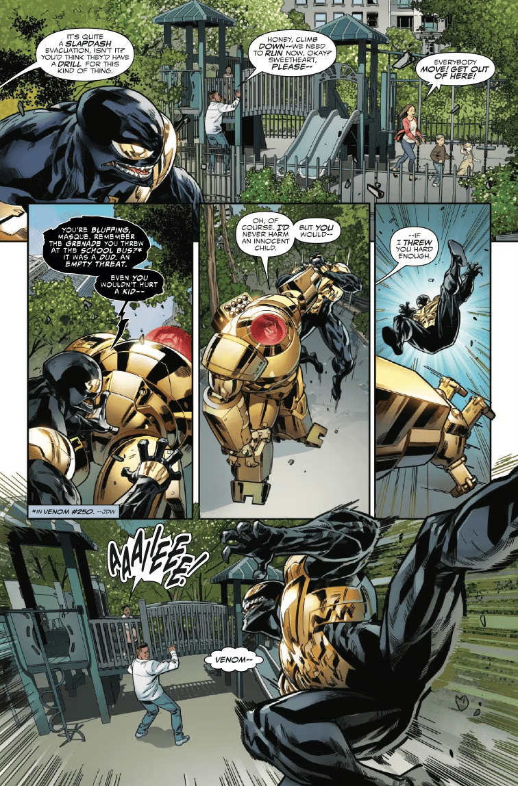 As if things weren’t difficult enough, there are innocent civilians that need to be kept a hair’s width away from the destruction. The symbiote and host duo have to get creative to keep everyone alive, minimize damage, and outmatch Masque, who has traded her signature assassin stealth for a guns-blazing fury in her bombastic mech suit. Making A.I.M. a respectable threat is her goal as the organization’s new head, and she wants to use Venom as an example to the world. And while those ambitions sound rather serious, Al Ewing doesn’t let that get in the way of his fun, bringing out a campier side of Masque’s stone-cold personality. If her golden face was adorned with a mustache, she would definitely be twirling it as she delivers one haughty one-liner after another.