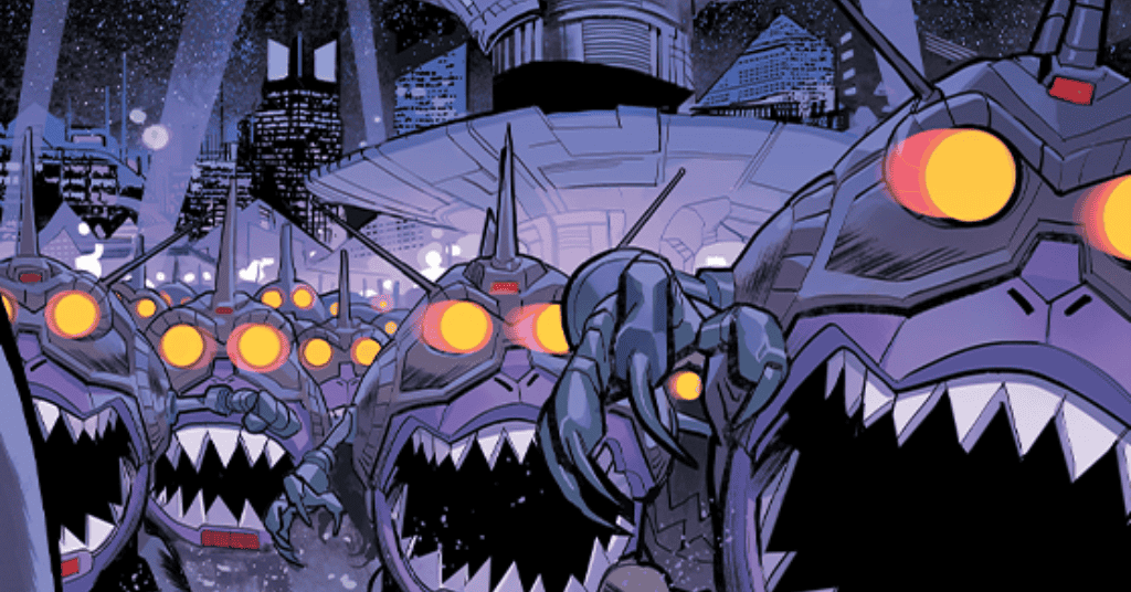 Void Rivals #26 picks up with the emergence of the Quintessons, showcasing the Zertonians’ and Aggorians’ perspectives on the incoming conflict, specifically as it pertains to their own factions. As the tides of war begin to rise, the Quintessons reveal their ground troops, the Sharkticons, a ruthless force that seemingly acts as an endless cannon fodder for the already limited resources of the beings living on the Sacred Ring. Determined to assist his father and his people, Darak jumps into the action, already having some idea of what this enemy looks like after encountering them earlier in the series.
