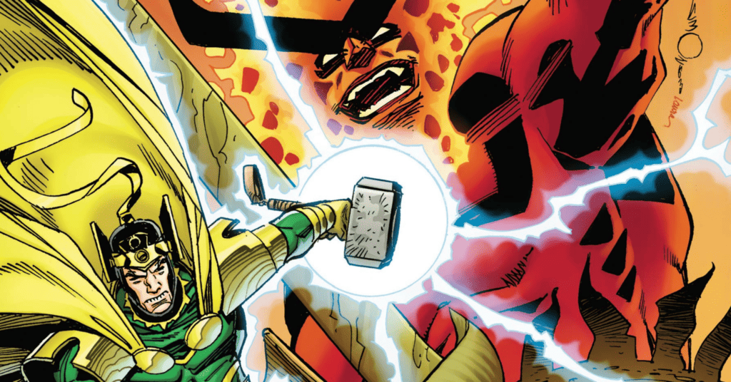 While Simonson’s iconic artwork graces the comic’s cover, long-term readers may be surprised to find the interiors are drawn by Scot Eaton (and inked by Cam Smith and Scott Hanna) rather than Simonson himself. Eaton, who drew Thor for a spell in the early 2000s, redraws several panels of Kirby’s art in a way that leads naturally into this comic’s new material while retaining some of Kiby’s charm. One of the best stylistic choices is Loki’s costume change early in the comic from Silver Age scalemail to Simonson’s iconic 1980s redesign, which helps to bridge the gap between the two eras. Given Simonson’s unique voice as a writer and artist, it’s a change that feels not only natural but needed. Colorist Andrew Dalhouse uses a few digital brushes that feel at odds with the one-shot’s nostalgic and analog feel but generally makes smart choices that keep Eaton’s busiest compositions readable. While many Thor readers no doubt associate Simonson with letterer John Workman, Travis Lanham imbues his own digital lettering with a dash of vintage charm.
