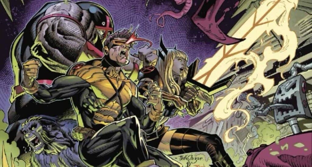 Netho Diaz and Sean Parsons have returned to MacKay’s X-Men, replacing Tony S. Daniel and Mark Morales. The duo previously worked on issue #21 and several other issues before that. Their work in X-Men #26 feels like a return to form in more ways than one. Readers can feel the cozy atmosphere of Glob’s vegetable stand and the rundown state of the trashed police station following Chief Robbin’s abduction. While Diaz’s and Parsons’ work excels in some areas, the blocky faces of some characters like Cyclops or Psylocke feel downright cartoonish at times.