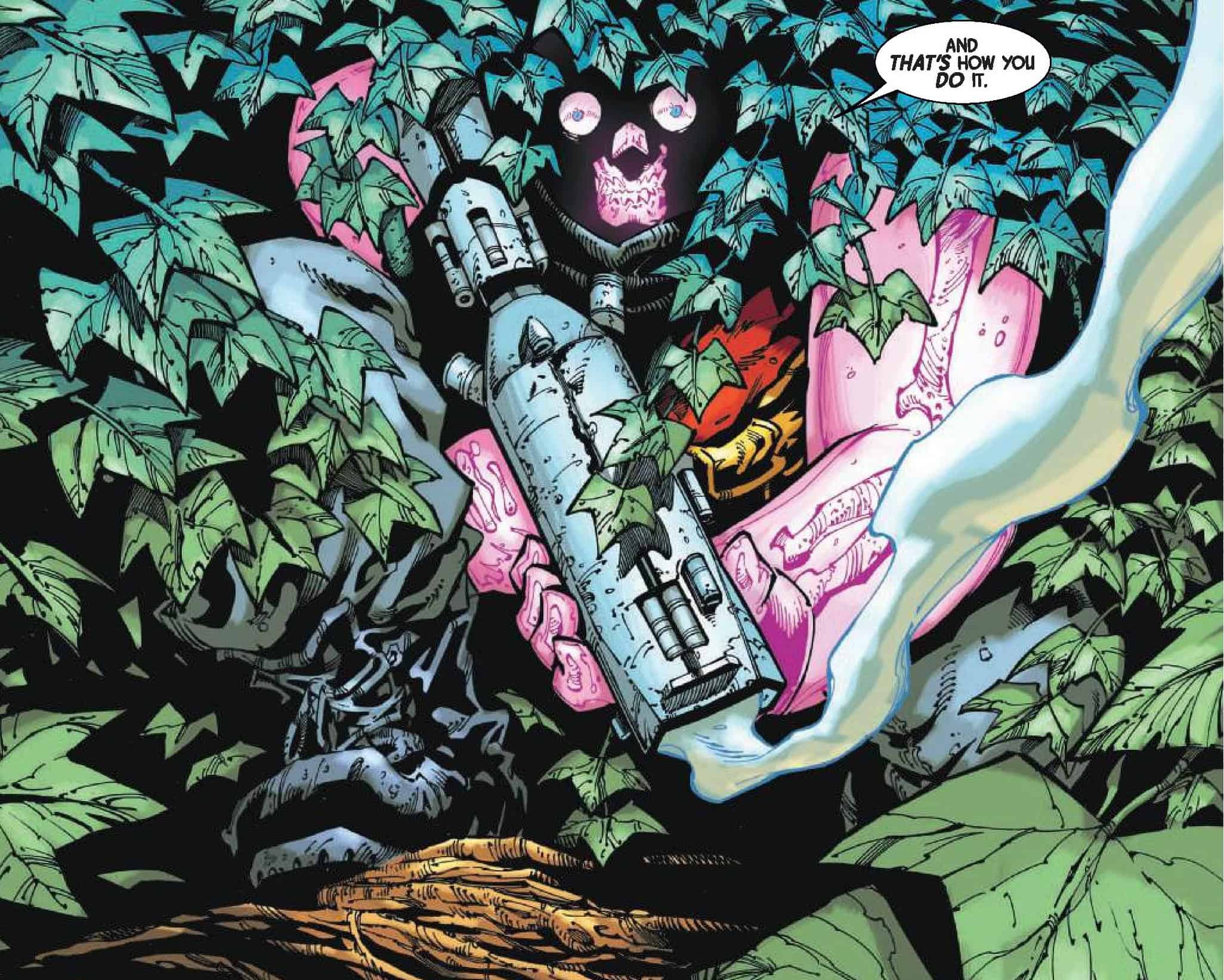 As for the art. Stegman’s best work is in the action shots and splashes to be sure, The establishing shot of Glob after he’s fired his weapon from the trees is superb, the battle between the rebel X-Men and Revelations Angel of Death is superb, cleverly punctuated by Magneto telling Scott he’s sorry before the forest resounds with the word no one on the run from him wants to hear: SNIKT! Stegman and the crew get to show mutant versus mutant action and get to blow heads off, blow people up, stab characters and have a whale of a time with a large amount of mayhem from the word go. What is very interesting is how this book carries the same kind of feeling of dystopia that say AOA did as a story but in a completely different environment. There are trees and living things galore from Stegman, inker JP Mayer and colorist Edgar Delgado and the story feels like it takes place in an endless forest of green. The art teams close up work in the quieter moments works too, you pick up the emotions of Revelation, Kwannon and several other one on one conversations throughout the book. Characters look like they are feeling what they are saying and this also helps sell this opener for me. Cowles get’s to have fun with some sound effects and I think it’s a very solid opener to the series from Stegman, Mayer and Delgado who sell this future ten years from the present from the first panel to the last. There’s a gritty but still cartoonish (not in bad way, in a good way) dynamism to the art style on offer here that I personally really enjoy, while others may prefer everything a little prettier, I think the art team deliver solidly on the tone the book is trying to set as we delve into the Age Of Revelation.
