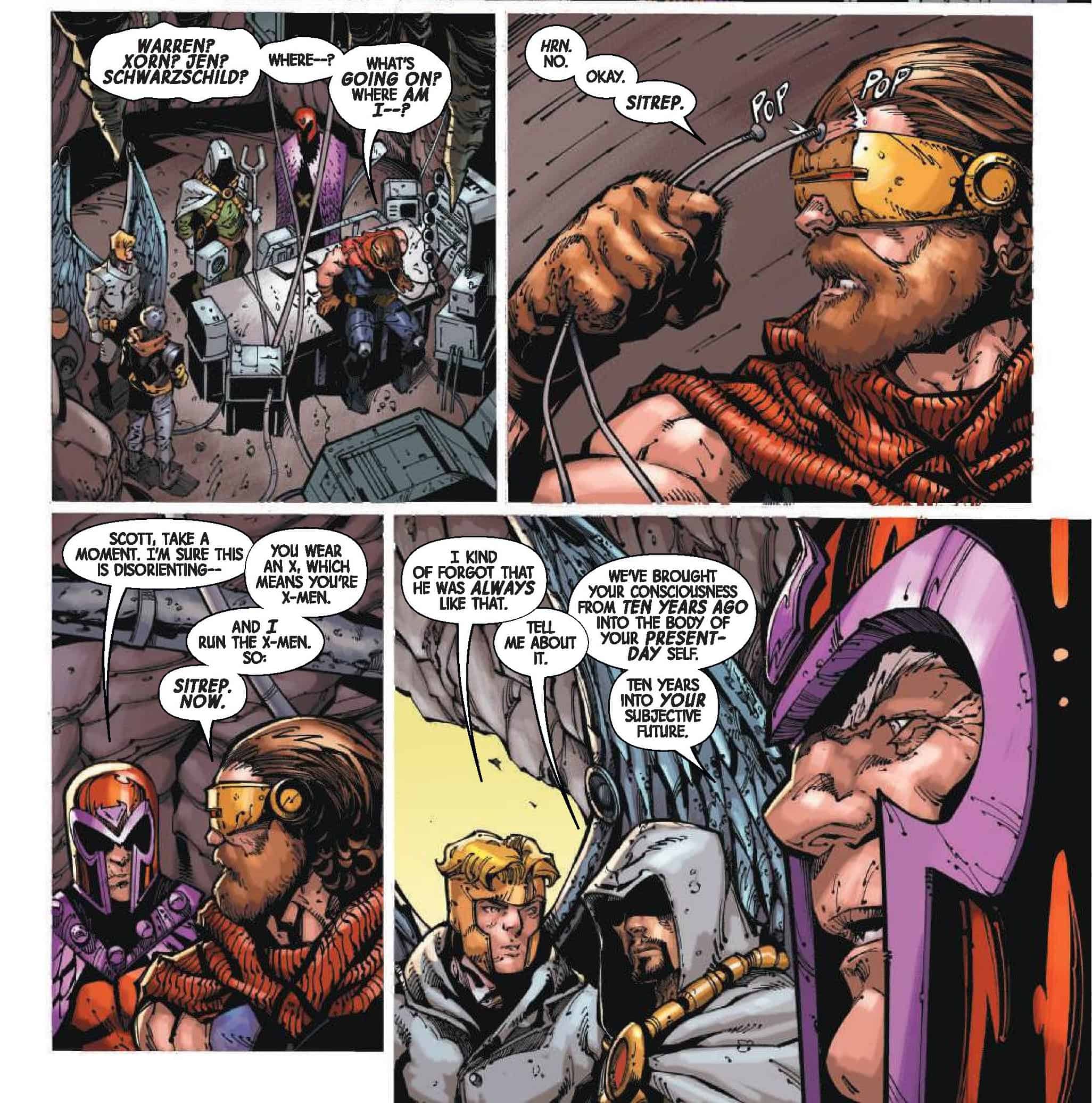 1. Overture: An orchestral piece at the beginning of an opera, play, etc. This issue is the opener in the next chapter of the ongoing opera of mutant kind. Mackay and the creative team have been able to do some setup previously but this issue is it’s full establishing shot, positioning pieces on the board orientating us as readers in a world X years later. That’s 10 years in the future. As for the opera part there is certainly no lack of drama. There’s bodies dropping like flies in this one. I won’t spoil it but some people are gonna be mad and surprised as Mackay and the creative team violently draw the lines between Revelation (Doug Ramsey) Heir of apocalypse and now ruler of the Revelation territories, which was once part of the United states. Mackay and the team move quickly to show you who is who and what side they are on without delving fully into the reasons some mutants are with Revelation and some are against. Although Magneto does make it clear why the rebel X-Men are against Revelation and what he has done, which he explains to Scott summers Sucked 10 years into his future self’s body. Scott’s joined by someone else from 10 years in the past but you can read the issue to find out who.