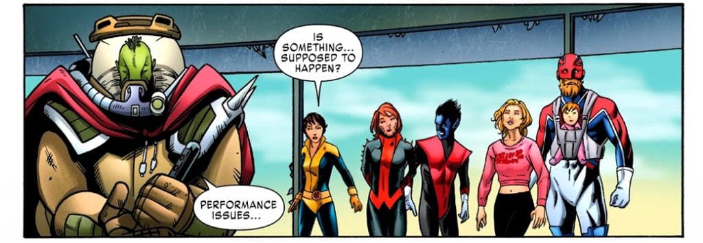 As Brian attempts to leave Maggie in the care of Kurt (or maybe the other way round) Rachel fends off Starhammers tendrils and says whoever he is he has chosen a bad day to attack. Starhammer asks if she remembers him and she gives the correct answer of no (at least someone is keeping track here) and Kitty phases outside into the path of a uniformed Captain Britain who offers her old costume to her. Clearly, the baby carrier proved too difficult for Kurt as Brian is wearing it and fielding questions from Maggie mid-battle. Rachel asks her own questions and gleans from Starhammer his true origin, which causes her to correct him on her place in the ongoing drama. Kurt comments on the baggage and Kitty wonders what he means as Meggan goes full feral and tears through the aliens mechanical tentacles. Having had enough, Starhammer presses a button on a device and when nothing happens Kitty comments on the lack of any effect. What follows is good old team comedy as they patiently await his ineffectual master-plan.