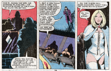 Professor Xavier returns home from Shi’ar space. After the discovery of two new mutants, the X-Men are split into two teams to go and find them and convince them to join Xavier’s cause. Here we meet Kitty Pryde (Shadowcat) and Alison Blaire (Dazzler) for the first time. The Hellfire Club have infiltrated Cerebro and Emma Frost gets there first to visit Kitty at her home and tries to recruit her. At both points, the X-Men are attacked by soldiers of The Hellfire Club. The team that was with Kitty (including Xavier) is captured and taken prisoner by Emma Frost, Kitty stows away and helps alert the others. The team that goes after Dazzler is lucky enough to evade their attackers, though not before Jean has another encounter with Jason Wyngarde, furthering his hold on her.