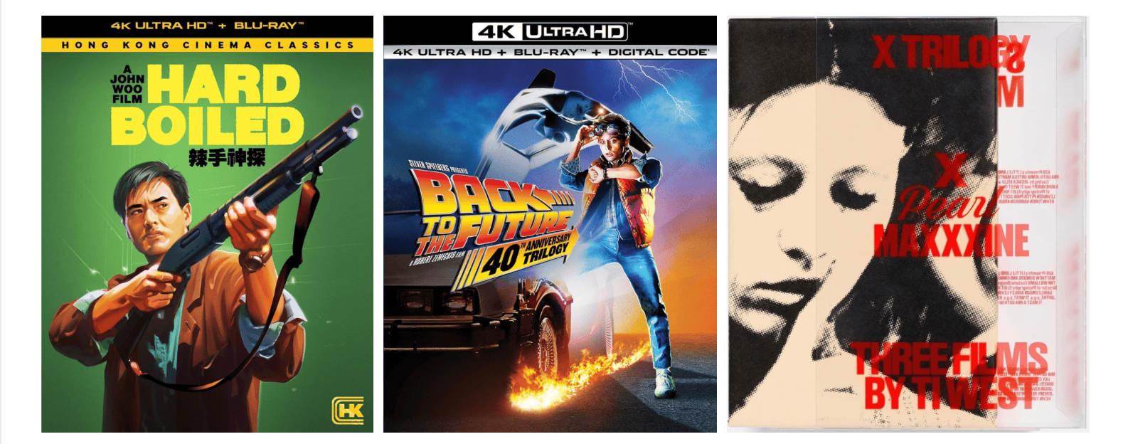 3-Disc Collector’s Edition Box Set of Ti West’s X Trilogy: X, Pearl, and MaXXXine available in Blu-ray and 4K UHD formats, marking the first physical release of X and Pearl on 4K UHD in the US. The box set includes a 64-page booklet with a new essay by Jon Dieringer, unreleased concept art, costume sketches, behind-the-scenes photography, original poster and VHS artwork created as set dressing for the films, and more, alongside over 90 minutes of making-of featurettes and new commentary tracks on all three films. Packaging features a blood-red printed plastic sleeve around a rigid slipcase containing a custom photo-collage 3-disc digibook.